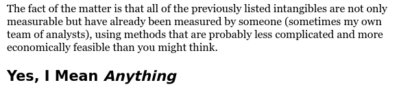 • However, while I agree it is good to be aware of such things, I am not convinced how to usefully take such consideration into account while making decision when to engage in an analytical, quantitative decision-making procedure (like the one Hubbard presents). Afterwards, when I tried to come up with more examples of situations where organizations or individuals falsely pretend to be interested in either undervaluing or overvaluing something intangible, I concluded that collecting the information would be useful if you are in position to make a decision about the matter in the first place. Conversely, if you are a nobody in the hierarchy and can’t affect the $thing, it won’t make much difference if you find out how much value the purportedly intangible $thing has or makes, so maybe researching the matter is not very good way to use your time. (And maybe it is: if you know that the organization is allocating resources in sub-optimal way, and while you can’t affect it, it may be useful consider while making decision. Sell the stock? Vote for a different party? Relocate from the municipality? Brush up your CV?)