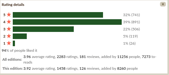 Given the book tells a lot about measuring things, I start with looking at some measurements about the book. (More or less, the following summarizes my initial impressions, as the book was not suggested by me, but a friend; I personally had not heard about it beforehand.) It has 433 pages, a respectable length but not too long. On GoodReads, it enjoys generally favorable ratings (average rating 3.96 on five star scale, with 2 283 ratings and 181 written reviews). The ratings distribution looks more encouraging than the mere central tendency reported by the mean would imply: